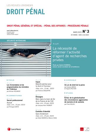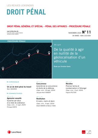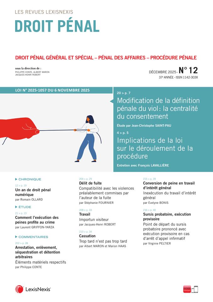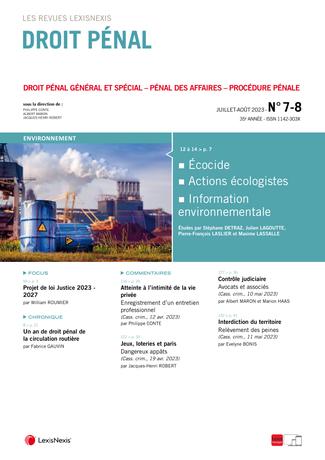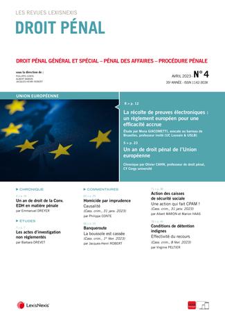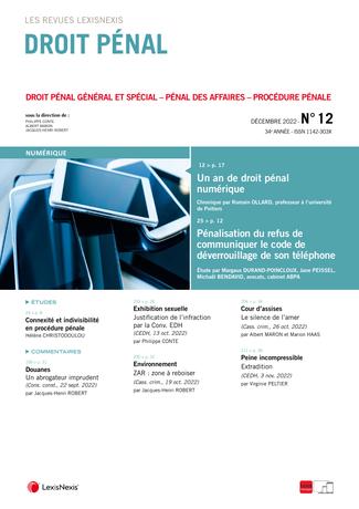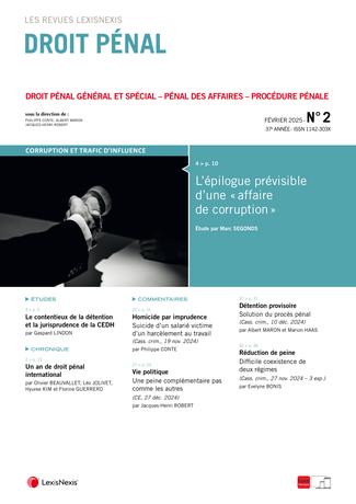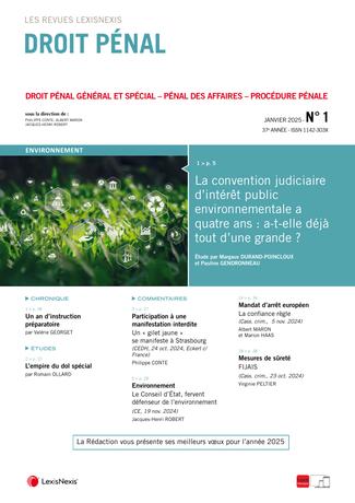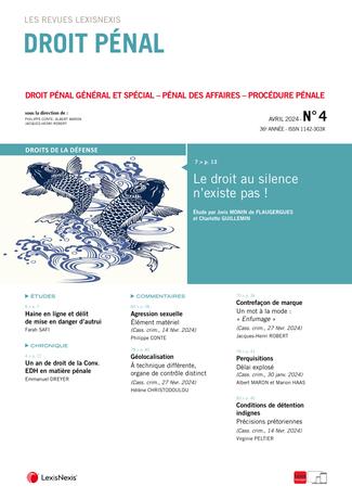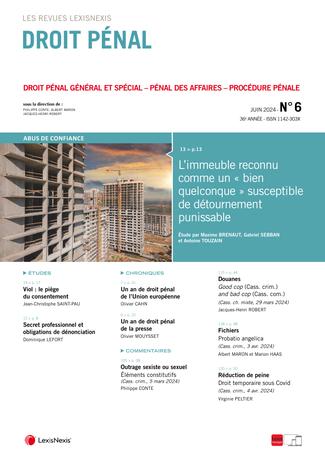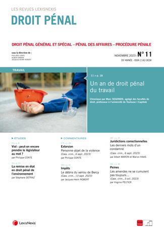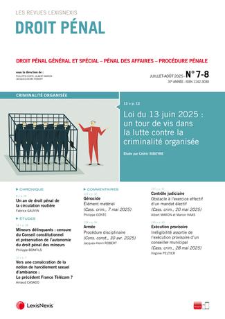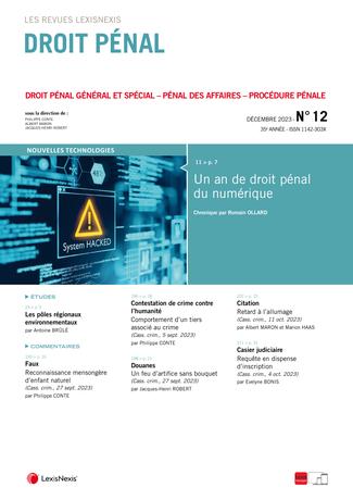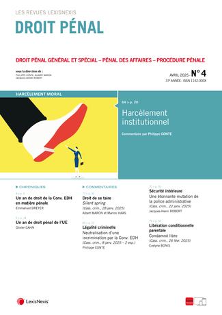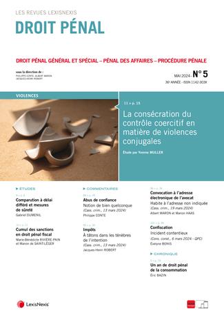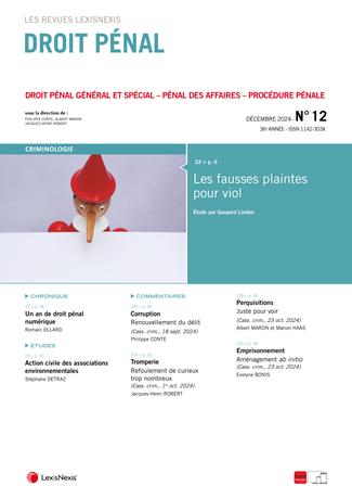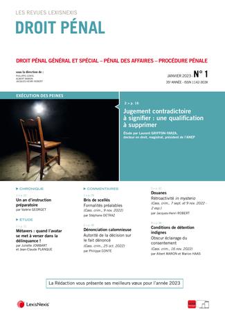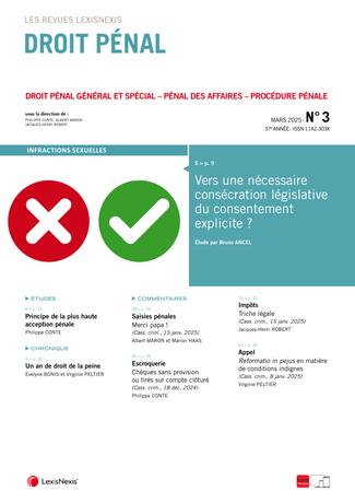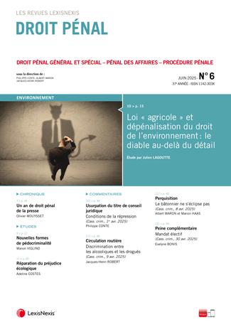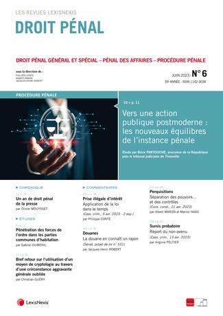 La revue “Droit Pénal” se fait chaque mois l’écho de l’actualité en droit pénal en sélectionnant les informations essentielles, les décisions les plus pertinentes, livrées en larges extraits et commentées par des pénalistes de renom.