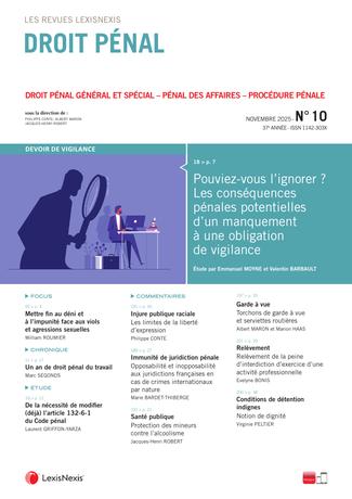 La revue “Droit Pénal” se fait chaque mois l’écho de l’actualité en droit pénal en sélectionnant les informations essentielles, les décisions les plus pertinentes, livrées en larges extraits et commentées par des pénalistes de renom.