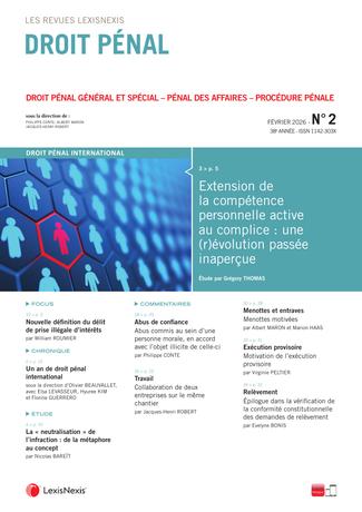La revue “Droit Pénal” se fait chaque mois l’écho de l’actualité en droit pénal en sélectionnant les informations essentielles, les décisions les plus pertinentes, livrées en larges extraits et commentées par des pénalistes de renom.