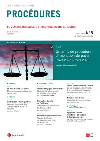 La revue Procédures, qui s’adresse notamment aux avocats, ouvre ses prestigieuses colonnes à un commentaire régulier, spécialement dédié aux évolutions du droit positif concernant cette profession....