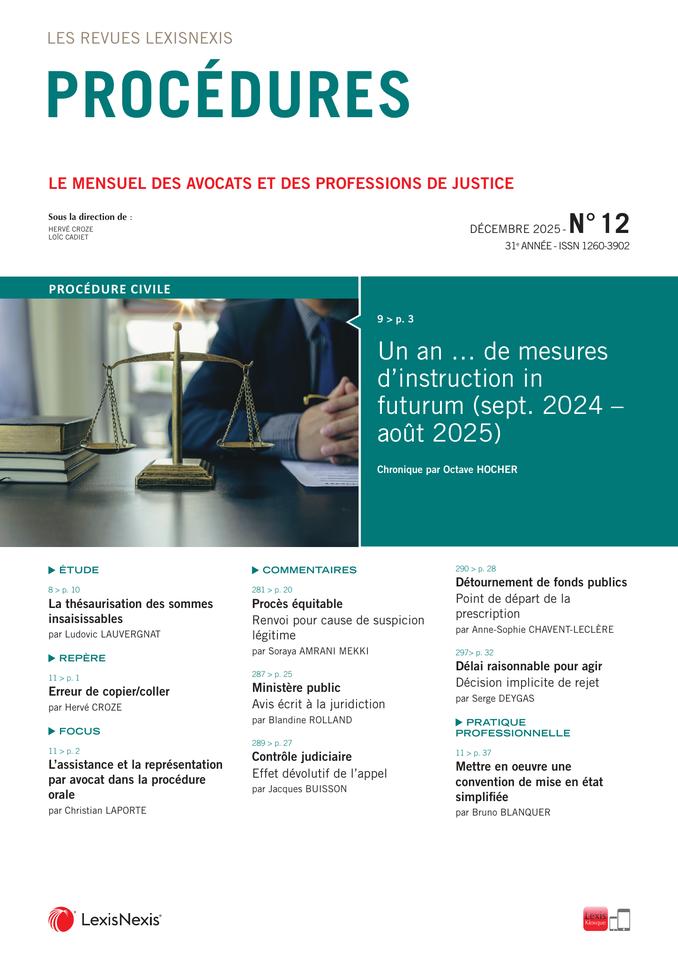 procédures spécifiques (contentieux du travail, arbitrage, contentieux de la famille …), des procédures européennes ainsi que des procédures pénale, administrative et fiscale. Après un article de synthèse, chaque numéro offre une sélection pertinente de l’actualité des textes et de la jurisprudence, traitées sous forme d’extraits commentés qui sont parfois assortis de conseils pratiques ou d’argumentaires.